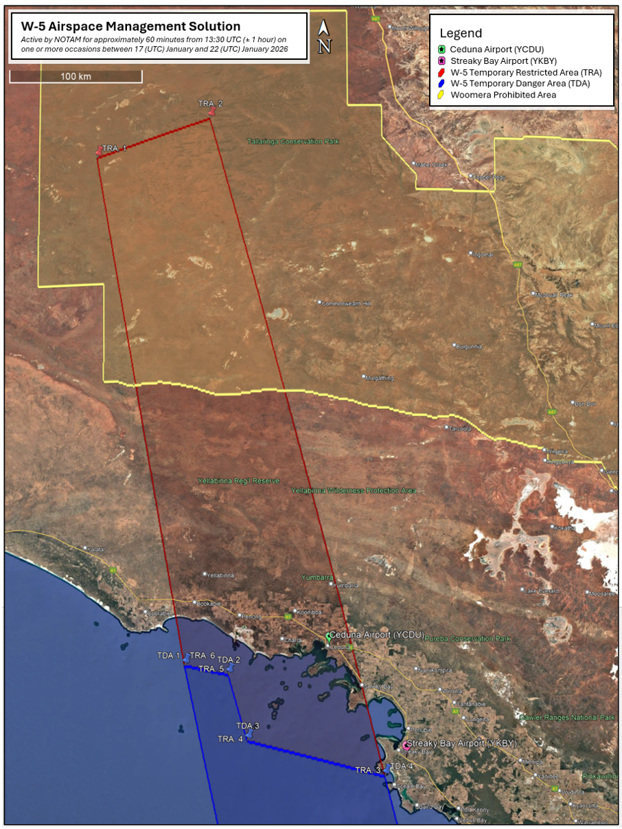 Landowners in the vicinity of the Koonibba Test Range, users of the Yellabinna Wilderness Area, Yellabinna Regional Reserve and Yumbarra Conservation Park, and persons travelling on the A1 Highway between Ceduna and Penong are advised to remain alert that minor pieces of debris from W-5 may return to land in these areas.